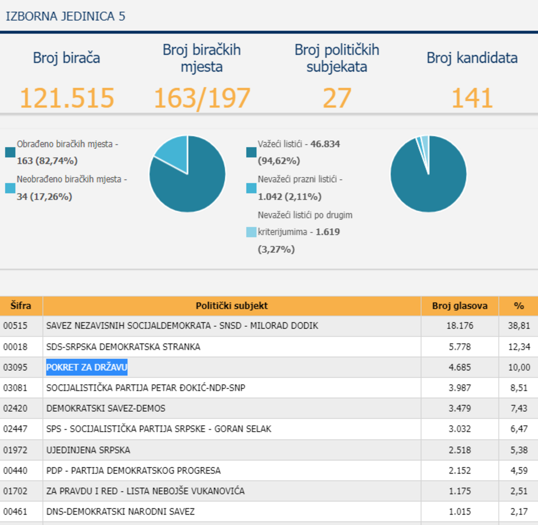 Lista "Pokret za državu", sudeći po rezultatima izbora koji se još uvijek zbrajaju, mogla bi imati 6 zastupnika u Narodnoj skupštini Rs.