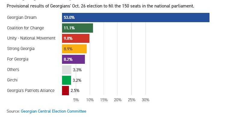 Udio od 53 posto glasova koji je postigao Gruzijski san omogućio bi vladajućoj stranci da formira vladu bez potrebe za koalicijom s drugim strankama.