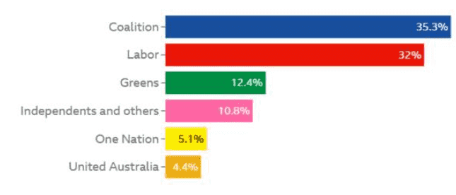 U roku od nekoliko sati nakon zatvaranja birališta, višestruki izborni analitičari rekli su da je jasno da vladajuća koalicija – predvođena konzervativnom Liberalnom strankom Scotta Morrisona i Nacionalnom strankom sa sjedištem na selu – ne može zadržati 76 mjesta koje je imala, što je minimum potreban za formiranje parlamentarne većina.