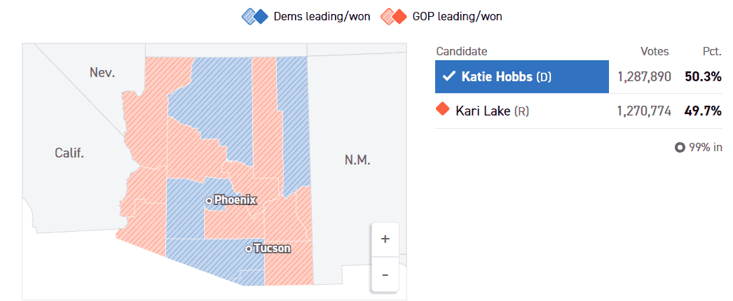 Demokrata Katie Bobbs tijesno je pobijedila republikanku Kari Lake, popularnu TV voditeljicu. Lake je odbila priznati rezultate izbora tvrdeći da su "naštimani". U Okrugu Kočiz ona je za 18 posto pobijedila Bobbs. No, ta izborna jedinica ne utiče na konačni ishod utrke i činjenicu da je republikanska kandidatkinja izgubila.