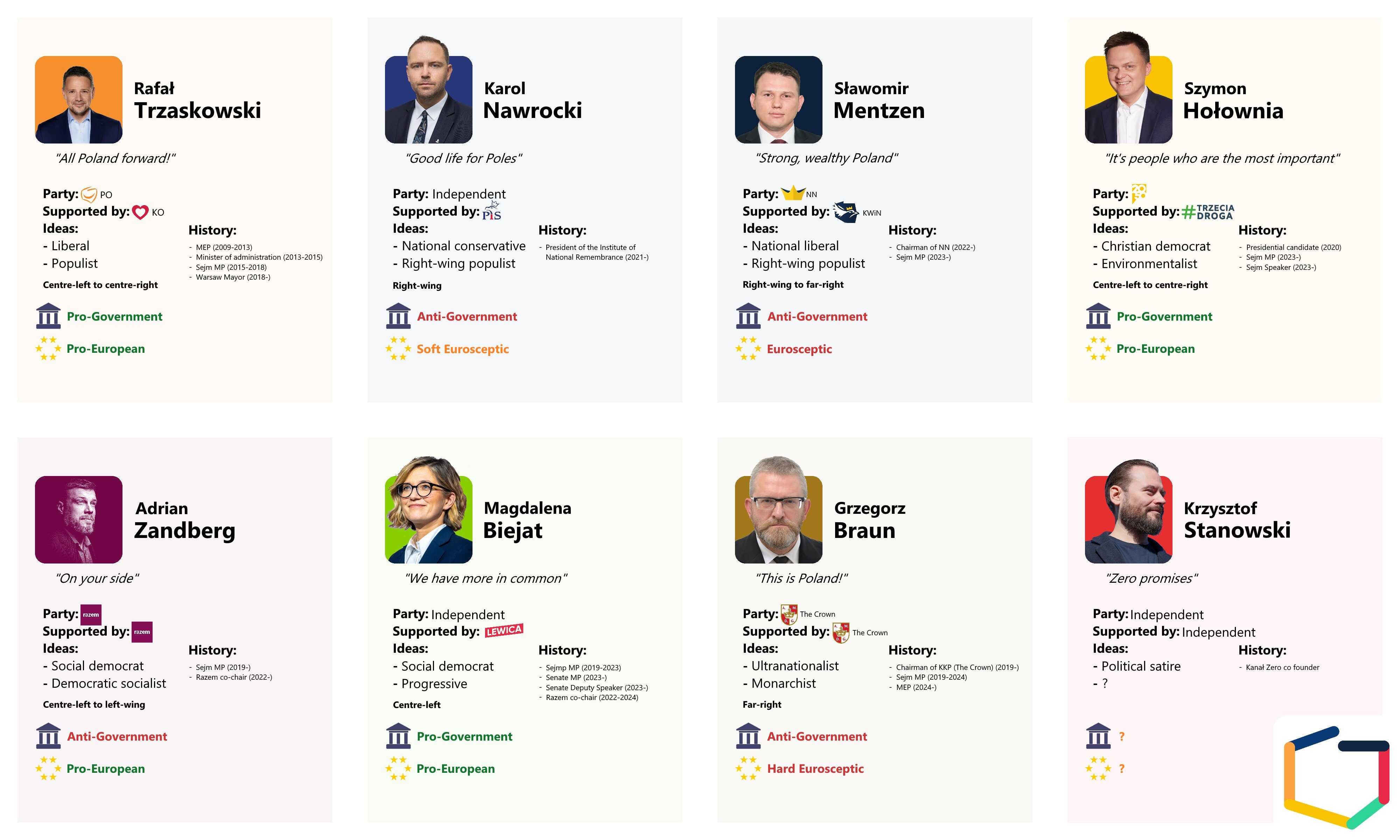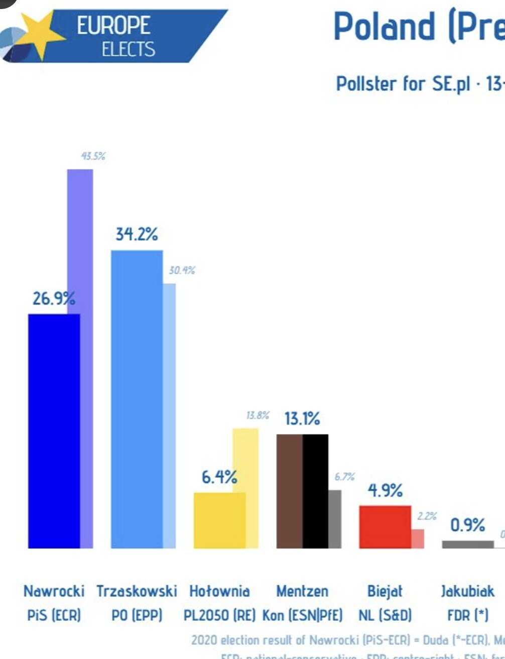 U anketama je 53-godišnji Trzaskowski, koji je trenutno gradonačelnik Varšave, nedavno vodio s dobrih 30 posto. Četrdesetdvogodišnji Nawrocki, kojeg podržava nacionalna konzervativna bivša vladajuća stranka Pravo i pravda (PiS), dobio je oko 25 posto, a slijedi ga krajnje desničarski kandidat Slawomir Mentzen s oko dvanaest posto. Na glasačkom listiću je ukupno 13 kandidata. Posmatrači stoga očekuju tijesnu utrku koja će vjerovatno biti odlučena tek u drugom krugu izbora 1. juna.