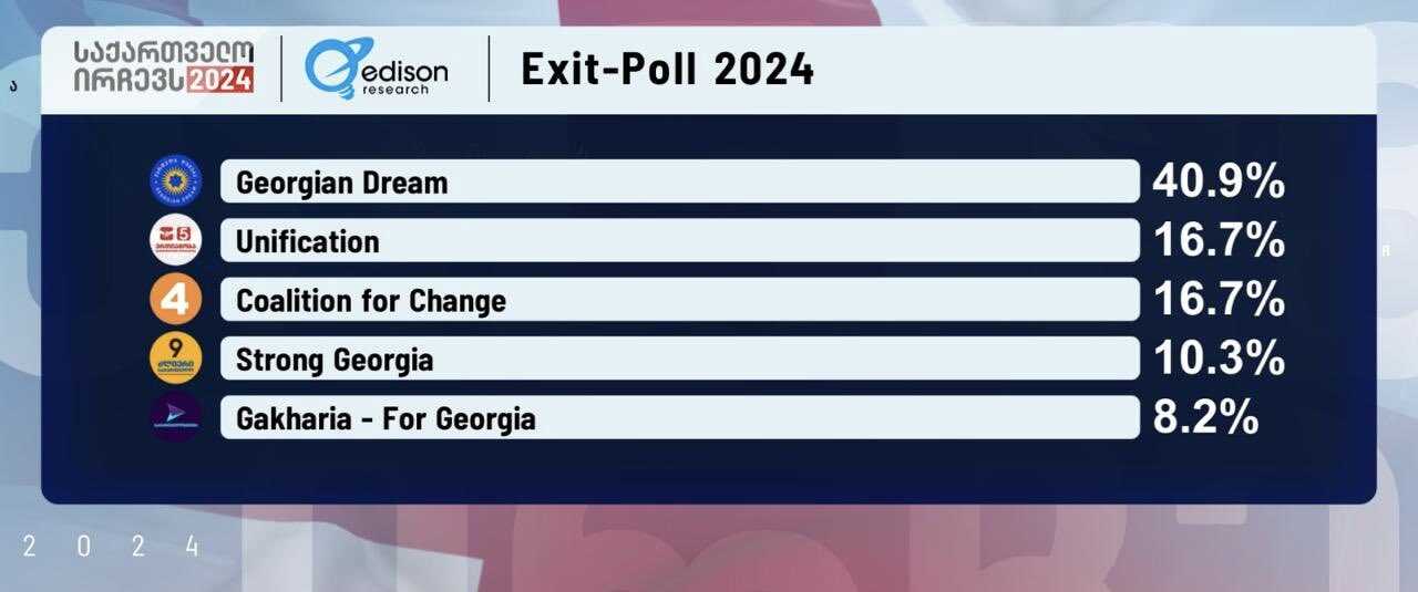 Stranka Gruzijski san ide u opoziciju sa 67 mandata na osnovu rezultata izlazne ankete Edison Researcha, čije je podatke objavila opoziciona TV kompanija Formula.
