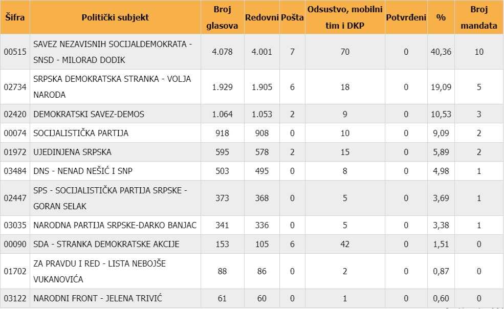 Od 11 stranaka koliko ih se kandidovalo za skupštinu u Foči mandate su osvojili SNSD deset, SDS-Volja naroda pet, Demokratski savez-Demos tri, Socijalistička partija i Ujedinjena srpska po dva. Po jedan mandat osvojili su DNS-Nenad Nešić i SNP, SPS-Goran Selak i NPS-Darko Banjac, dok stranke SDA, Za pravdu i red-lista Nebojše Vukanovića i Narodni front-Jelena Trivić nisu prešle izborni prag, piše Klix.