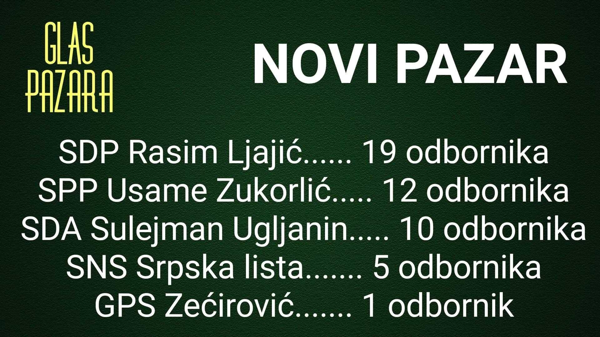 Prema nezvaničnim rezultatima lokalnih izbora u Novom Pazaru, lista “Evropski Novi Pazar – Rasim Ljajić” osvojila je najviše glasova, preko 17.000, što će im donijeti 19 od 47 odborničkih mandata, javlja novopazarski radio Sto plus.