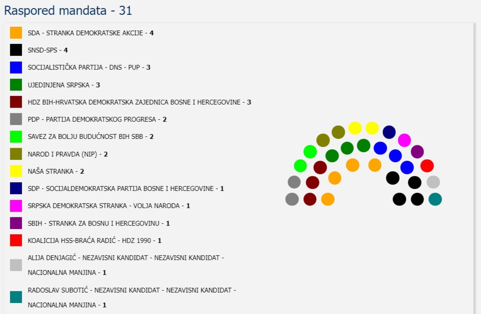 Slijede SPS, DNS i PUP, te Us i HDZ BiH sa po 3 vijećnika.