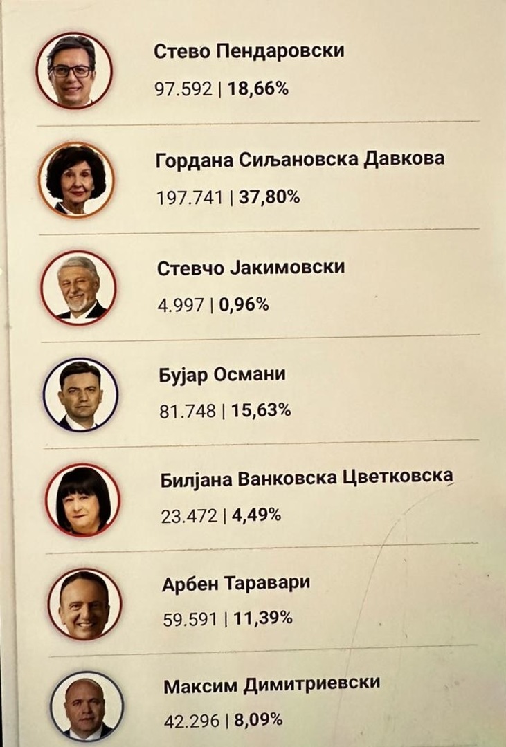 Prvi rezultati koje je Državna izborna komisija objavila na svom sajtu pokazuju da od obrađenih 71,19 posto glasova na predsjedničkim izborima u Sjevernoj Makedoniji, odnosno 2.490 od ukupno 3.508 biračkih mjesta, vodi kandidatkinja VMRO-DPMNE Gordana Šiljanovska Davkova sa 247.366 glasova (39,15%). , ispred Steve Pendarovskog iz SDSM-a sa 121.228 glasova (19,19%).