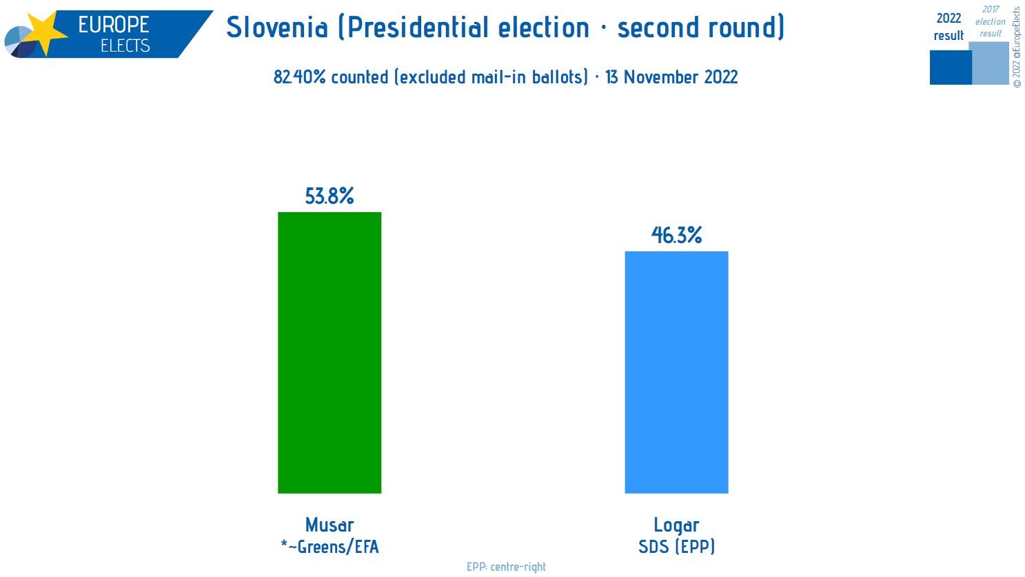 Nakon prebrojanih 55,52 posto glasova, prednjači Nataša Pirc Musar sa 54,18 posto glasova, a slijedi je Anže Logar sa 45,82 posto glasova. Ona vodi u svim ljubljanskim izbornim jedinicama, kao i u Mariboru, Kopru, Slovenj Gradcu, Novoj Gorici i Murskoj Soboti. Trenutni odziv birača je 44,08%, piše 24ur.com.