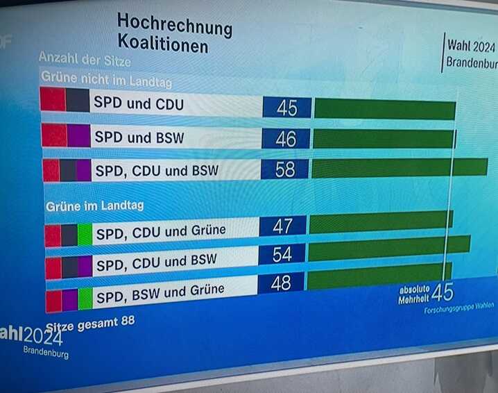 Prema prvim signalima dosadašnjeg premijera i kandidata SPD-a Woidkea moguć je nastavak dosadašnje koalicije SPD-a CDU-a i stranke Zeleni koja vlada ovom saveznom pokrajinom od 2019. ali to ovisi o tome hoće li Zeleni uspjeti ući u parlament u Potsdamu.