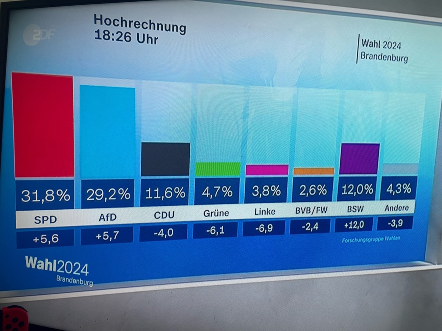 No kako je biralo oko 2,1 miliona građana Brandenburga s pravom glasa? Prema podacima javnog servisa ARD-a koje se temelje na prebrojanim glasovima, SPD je biralo 30,9 posto građana, AfD 29,2.