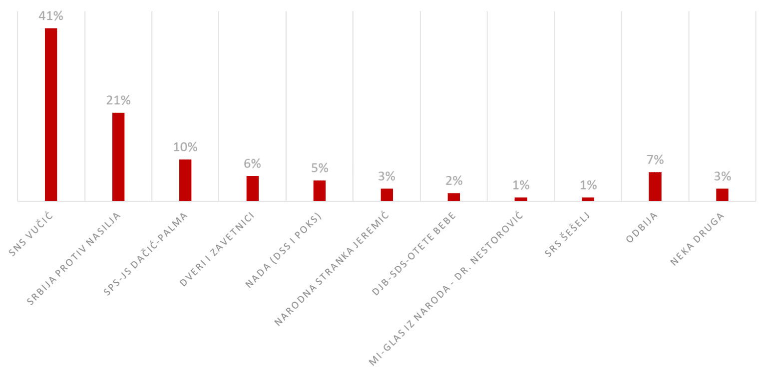 U istraživanju agencije Metrics pred parlamentarne i djelimične lokalne izbore, većina ispitanika prednost daje Srpskoj naprednoj stranci Aleksandra Vučića. No, on - zajedno s partijama koje je okupio u širokoj koaliciji - može računati između 39 i