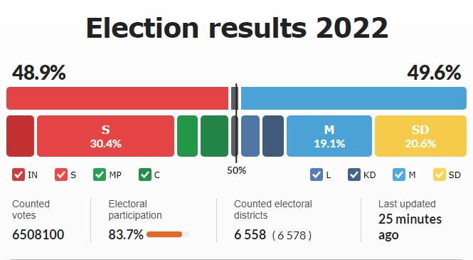 Umjereni, švedski demokrati, demokršćani i liberali imali su prednost od jednog mjesta nakon nedjeljnih izbora, ali je izgledalo kao da će dobiti 176 mjesta u parlamentu od 349 mjesta.