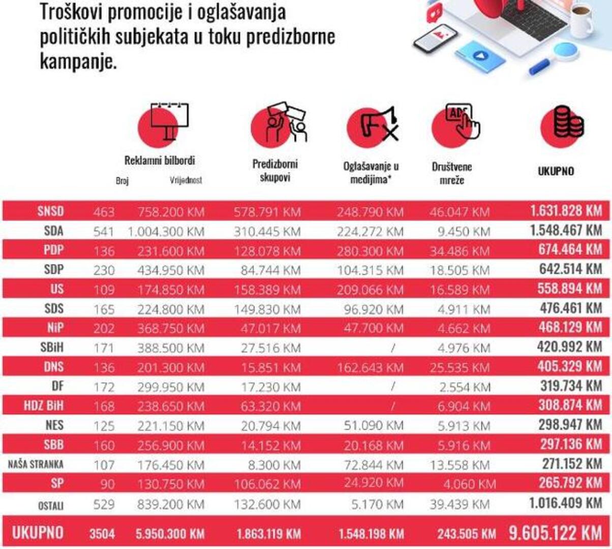 Ovi iznosi nisu konačni, jer nisu uključeni troškovi oglašavanja i predizbornih skupova u ovoj posljednjoj sedmici izborne kampanje, kao ni drugi oblici oglašavanja koje TI BiH nije pratio, ali se već sada može reći da se radi o jednoj od najskupljih izbornih kampanja u BiH, jer po podacima CIK-a stranke nikada nisu prijavile veće iznose.