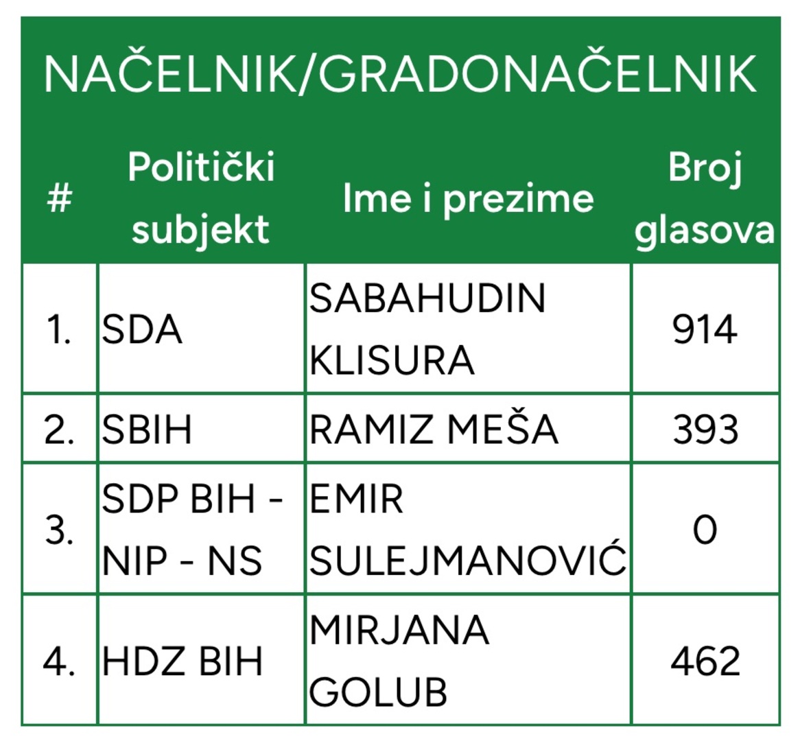Sabahudin Klisura, kadar je SDA. Ramiz Meša je ispred Stranke za BiH, a HDZ je kandidirao Mirjanu Golub.