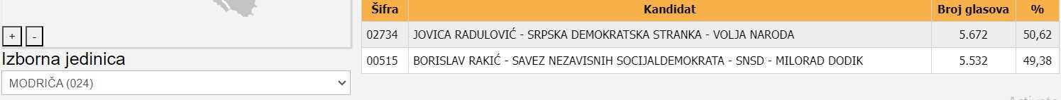Iako je utrka bila tijesna, kandidat Srpske demokratske stranke Jovica Radulović pobijedio je Dodikovog pulena Borislava Rakića.