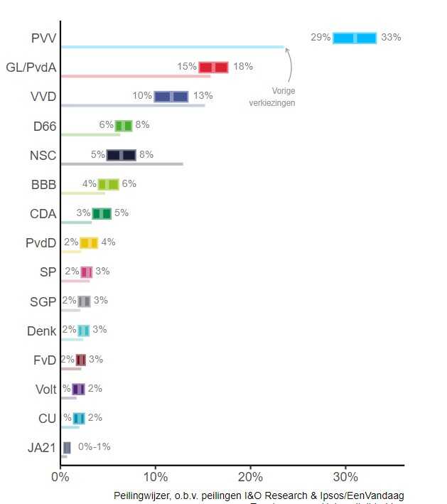 Od Holanđana koji žele glasati na evropskim izborima 6. juna, četvrtina planira da to učini za PVV, izvještava istraživačka agencija Ipsos I&O u anketi na vlastitu inicijativu. Time bi partija Gerta Wildersa, koja nije osvojila nijedno mjesto u 2019., dobila čak devet mjesta.