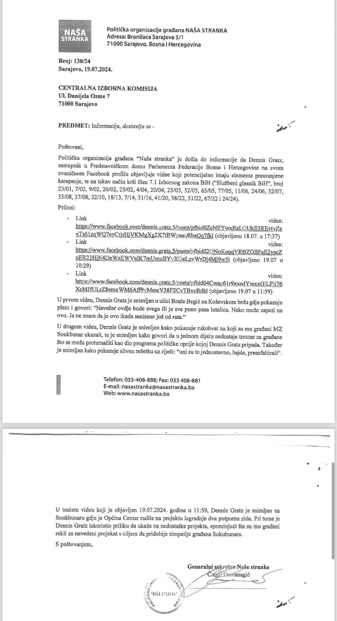 Predsjednik Kantonalnog odbora Demokratske fronte Albin Zuhrić objavio je prijavu Naše stranke upućenu Centralnoj izbornoj komisiji protiv Dennisa Gratza.