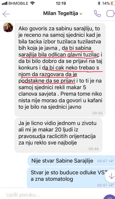 “Ako govoriš za Sabinu Sarajliju, to je rečeno na samoj sjednici, kad je bila tačka izbor tužioca Tužilaštva BiH, da bi Sabina Sarajlija bila odličan glavni tužilac i da bi bilo dobro da se prijavi na taj konkurs i da bi čak neko trebao s njom da razgovara da je podstakne da se prijavi“, objasnit će Tegeltija činjenicu da njegov prijatelj iz Sarajeva zna odluke VSTV-a iz bolje budućnosti.