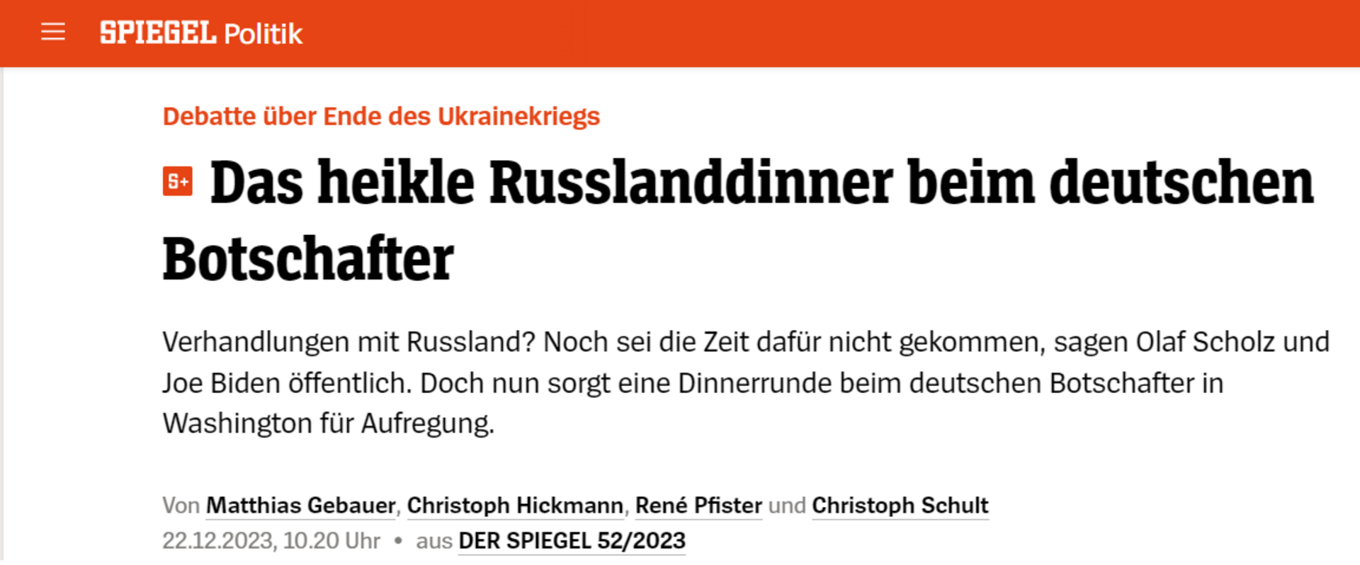 Jedan učesnik večere je to ovako shvatio: glavni čovjek njemačkog kancelara želi da njemačkim odbijanjem članstva Ukrajine u NATO insipirira Putina da potpiše mirovni sporazum. U Schmidtovom okruženju i ovo predstavljaju drugačije. Članstvo Ukrajine u NATO će, kako navode, ionako biti na dnevnom redu tek nakon rata. O tome se trenutno uopće ne može donijeti odluka. Večera u ambasadi bila je prosta, otvorena razmjena ideja, na kojoj se njemački glavni ministar prvenstveno želeo upoznati sa razmišljanjima američkih mislilaca.