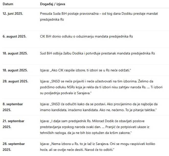 Kada je CIK, 28. augusta, raspisao izbore (za 23. novembar 2025.), Dodik je reagovao izjavom: