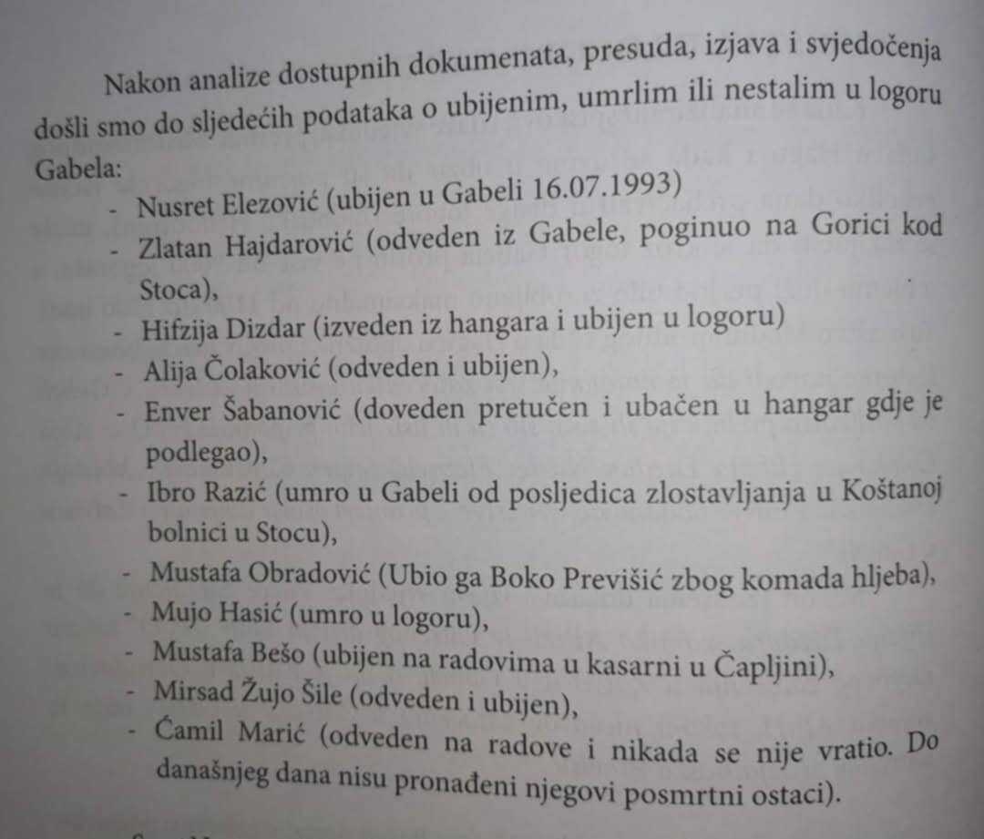 Epilog postojanja koncentracionog logora Gabela je 11 ubijenih logoraša, od čega je osobno Boško Previšić Boko usmrtio 18 godišnjeg Mustafu Obradovića pred hangarom broj.1 što je vidjelo par stotina logoraša, radi čega, radi komada hljeba kojeg je našao u njegovu džepu.