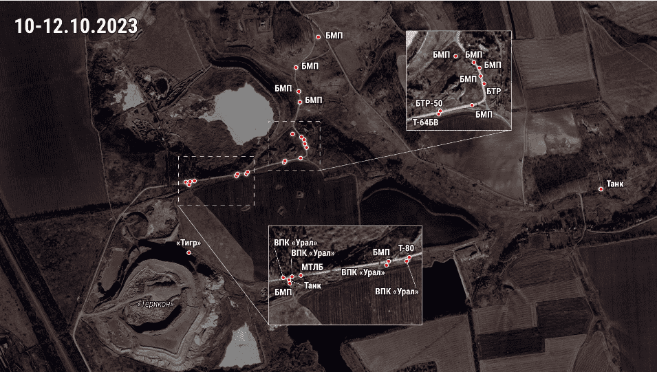 Prema ukrajinskoj vojsci i blogeru Kriegsforscheru, samo na jednoj raskrsnici uništeno je pet ruskih borbenih vozila pješadije, dva oklopna transportera, uključujući stari sovjetski BTR-50, i tenk T-64BV.