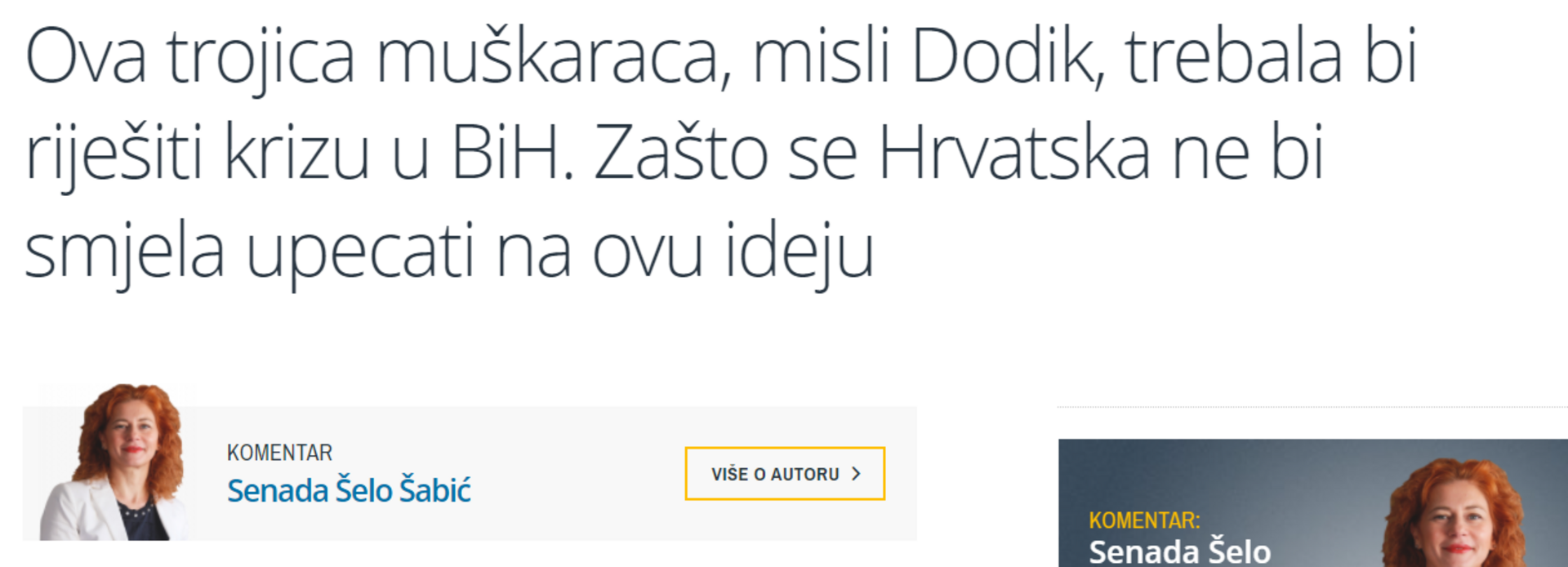 Već smo se navikli na različite 'hrabre' izjave Milorada Dodika, srpskog člana Predsjedništva BiH, tako da ni ova ne iznenađuje. No postavlja se pitanje: na kojim načelima bi ovi razgovori trebali moći razriješiti krizu u BiH? Zašto ova potencijalna pregovaračka grupa ima šansu za uspjeh, a druge inicijative, naprimjer one koje trenutno vode posebni izaslanici iz Vašingtona i Brisela, nemaju?", piše Senada Šelo Šabić za Tportal.hr.