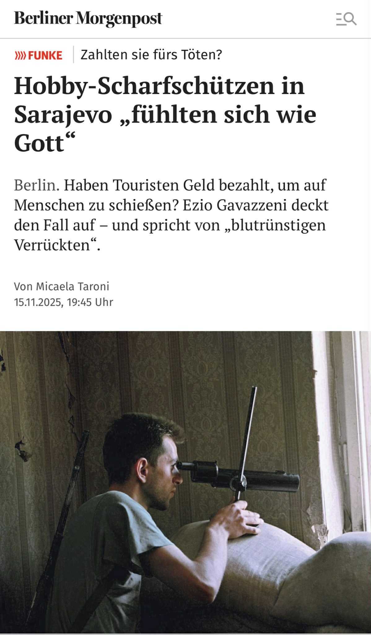 Tek 30 godina nakon kraja rata u Bosni tužilaštvo u Milanu pokrenulo je istragu zbog mogućeg „snajperskog turizma“. Radi se o sumnji da su bogati Italijani i građani drugih zapadnih zemalja u godinama 1993. do 1995. plaćali tadašnjim bosanskih snagama bosanskih Srba da bi nekoliko dana mogli pucati na civile. „Snajper-safari“ u Bosni prikrivali su se kao lovačka putovanja na Balkanu, koja su polazila iz Trsta. Istraga protiv navodnih hobi-snajperista pokrenuta je nakon prijave milanskog pisca Ezija Gavazzenija (66). On je tužilaštvu u Milanu predao dokumente i svjedočenja iz višegodišnjeg istraživanja. Redakcija njemačkog Berliner Morgenposta razgovarala je s Gavazzenijem. Berliner Morgenpost je renomirani njemački dnevni list sa sjedištem u Berlinu, poznat po kvalitetnom političkom i istraživačkom novinarstvu. Osnovan 1898., danas je dio FUNKE Mediengruppe, jedne od najuticajnijih medijskih grupacija u Njemačkoj. U ovom intervjuu koji nosi naslov Hobi-snajperisti u Sarajevu: „osjećali su se kao Bog“ Gavezzani govori o njegovom israživanju, cijeni tih safarija, strahu od opasnih ljudi ali i o interesovanju koju je njegova priča izazvala kod svjetskih medija.