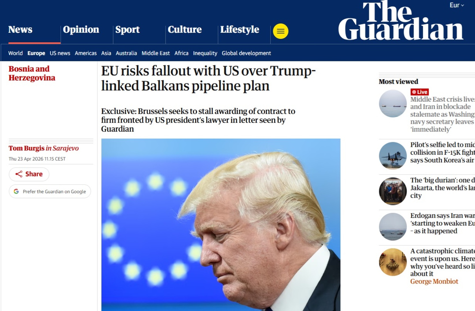 EU rizikuje konfrontaciju s Donaldom Trumpom nakon što je pokušala da odgodi dodjelu unosnog ugovora o balkanskom gasovodu kompaniji iza koje stoji njegov lični advokat, pokazuju dokumenti u koje je Guardian imao uvid.