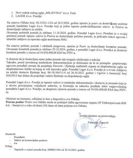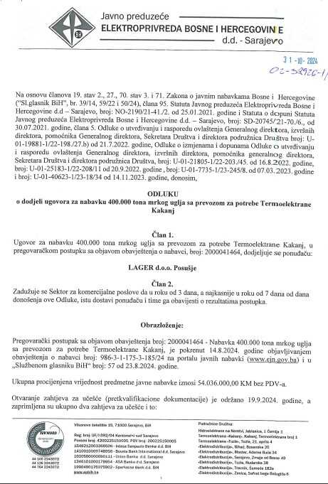 Ugovor je nabavljen u pregovaračkom postupku i bit će isporučen Termoelektrani Kakanj.