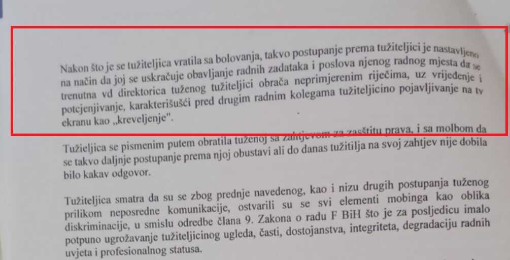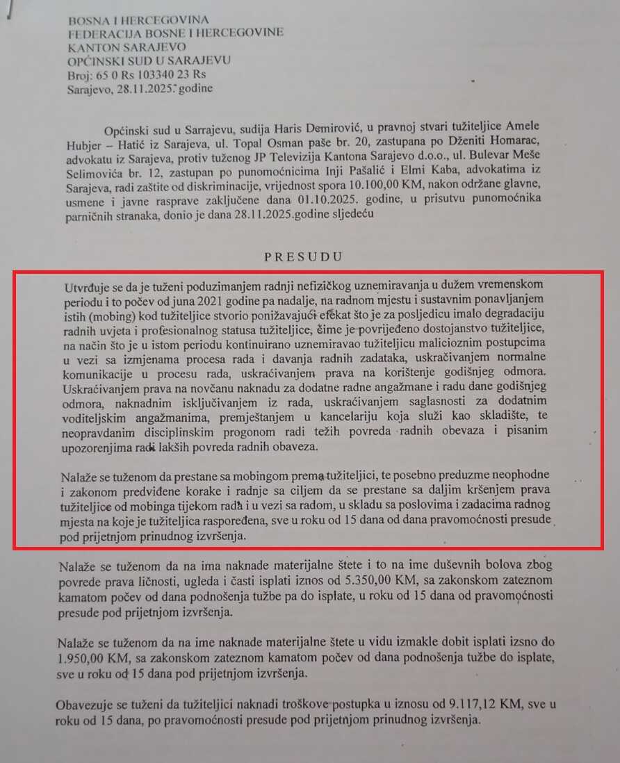 “Utvrđuje se da je tuženi (JP Televizija Kantona Sarajevo, op.a.) poduzimanjem radnji nefizičkog uznemiravanja u dužem vremenskom periodu i to počev od juna 2021. godine pa nadalje, na radnom mjestu i sustavnim ponavljanjem istih (mobing) kod tužiteljice stvorio ponižavajući efekat što je za posljedicu imalo degradaciju radnih uvjeta i profesionalnog statusa tužiteljice, čime je povrijeđeno dostojanstvo tužiteljice, na način što je u istom periodu kontinuirano uznemiravao tužiteljicu malicioznim postupcima u vezi sa izmjenama procesa rada i davanja radnih zadataka, uskraćivanjem normalne komunikacije u procesu rada, uskraćivanjem prava na korištenje godišnjeg odmora, uskraćivanjem prava na novčanu naknadu za dodatne radne angažmane i radu u dane godišnjeg odmora, naknadnim isključivanjem iz rada, uskraćivanjem saglasnosti za dodatnim voditeljskim angažmanima, premještanjem u kancelariju koja služi kao skladište, te neopravdanim disciplinskim progonom radi težih povreda radnih obaveza i pisanim upozorenjima radi lakših povreda radnih obaveza. Nalaže se tuženom da prestane sa mobingom prema tužiteljici…”, stoji u presudi Općinskog suda u Sarajevu od 28. novembra.