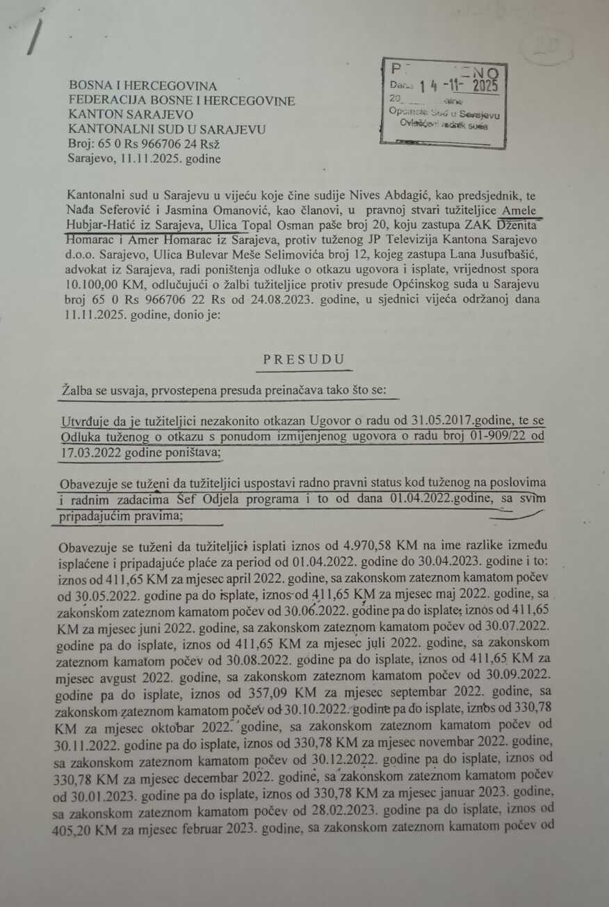 Istog mjeseca, 11.11.2025., Amela Hubjer Hatić je nakon žalbenog postupka dobila pravosnažnu presudu Kantonalnog suda u svoju korist kojom je utvrđeno da je nezakonito smijenjena sa pozicije šefa Odjela programa TVSA. Sud je naredio TVSA da je mora vratiti na mjesto sa kojeg je nezakonito smijenjena, sa svim pripadajućim pravima i materijalnom nadoknadom štete.