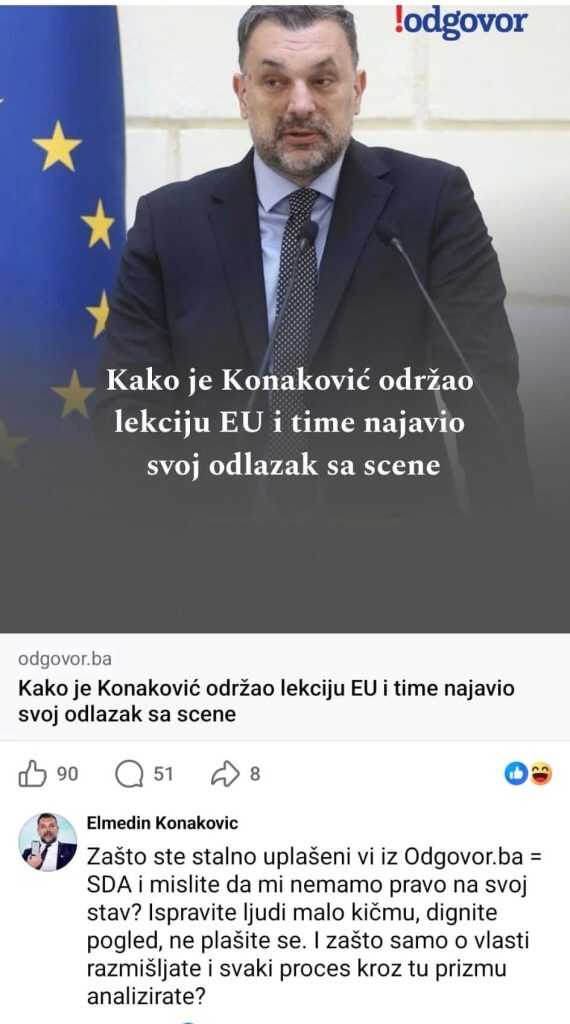 Kada je ministar vanjskih poslova BiH Elmedin Konaković, tokom proteklih mjeseci, napadao Istragu, NAP, Politički, Faktor, Avaz i Hayat, bilo mi je malo krivo što ne spominje i !Odgovor. Zavidio sam kolegama. Zato mi je bilo drago kada sam sinoć vidio da ministar izlio žuč na stranici našeg portala na Facebooku, i to ispod članka u kojem sam, uz detaljno obrazloženje, ocijenio da je njegova vladavina pri kraju.