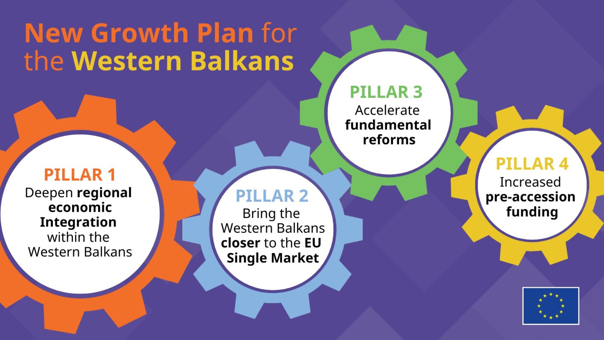 Prvi stub podržava ekonomsku integraciju unutar regiona putem postojećeg Zajedničkog regionalnog tržišta (CRM), u suštini sa ciljem da se razvije jedinstveno tržište za region inspirisano modelom jedinstvenog tržišta EU. Drugi stub nastoji da proširi ovu integraciju na nivo Evropske unije (EU), jačajući ekonomske veze regiona sa jedinstvenim tržištem EU. Treći stub je fokusiran na pružanje dodatne finansijske pomoći regionu kako bi se olakšali integracijski napori i podstakle neophodne reforme. Četvrti stub je dizajniran da ubrza suštinske reforme koje su potrebne da bi region ispunio standarde EU, služeći kao štap za finansijsku podršku. Zajedno, stubovi se bave kritičnim izazovima sa kojima se region trenutno suočava, kao što su slabe institucije, nedovoljne reforme, imperativ ulaganja u infrastrukturu i javna dobra, potreba za unapređenjem ekonomske i političke saradnje u regionu i regionalno tržište ograničenog obima.