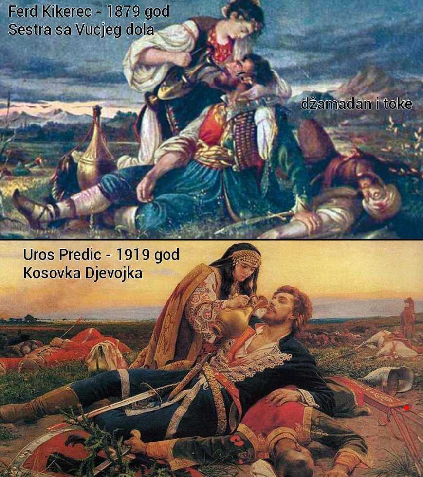 Plagiranje u svrhe prikazivanja stradanja nije nova pojava. Poznata slika Uroša Predića "Kosovska djevojka" plagijat je iz 1919. godine. Nastala je na osnovu trideset godina ranije naslikane slike "Sestre s Vučjeg dola" Ferda Kikereca.