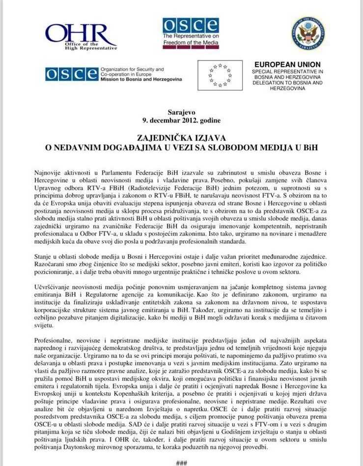 “Najnovije aktivnosti u Parlamentu Federacije BiH izazvale su zabrinutost u smislu obaveza Bosne i Hercegovine u oblasti neovisnosti medija i vladavine prava. Posebno, pokušaji zamjene svih članova Upravnog odbora RTV-a FBiH (Radiotelevizije Federacije BiH) jednim potezom, u suprotnosti su s principima dobrog upravljanja i zakonom o RTV-FBiH, te narušavaju neovisnost FTV-a. S obzirom na to da će Evropska unija obaviti evaluaciju stepena ispunjenja obaveza od strane Bosne i Hercegovine u oblasti postizanja neovisnosti medija u sklopu procesa pridruživanja, te s obzirom na to da predstavnik OSCE-a za slobodu medija stalno prati aktivnosti BiH u oblasti poštivnja svojih obaveza u smislu slobode medija, danas zajednički urgiramo na zvaničnike Federacije BiH da osiguraju imenovanje kompetentnih, nepristranih profesionalaca u Odbor FTV-a, u skladu s postojećim zakonima”, navodi se u zajedničkoj izjavi iz decembra 2012. godine.