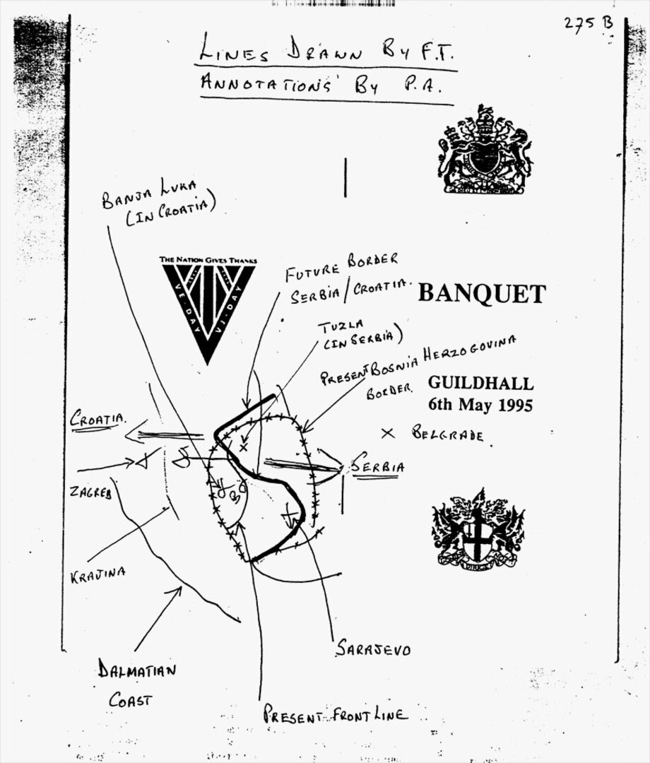 Tuđman je povukao liniju prema kojoj su, kako navodi Ashdown, Banja Luka i Sarajevo pripali Hrvatskoj, dok je Tuzla otišla u Srbiju.