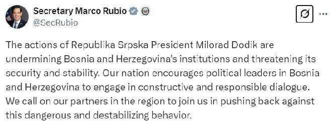 Pozivamo partnere u regionu da nam se pridruže i da zajednički odbijemo ovo opasno i destabilizirajuće ponašanje", objavio je Rubio na svom službenom nalogu na X-u 8. marta ove godine.