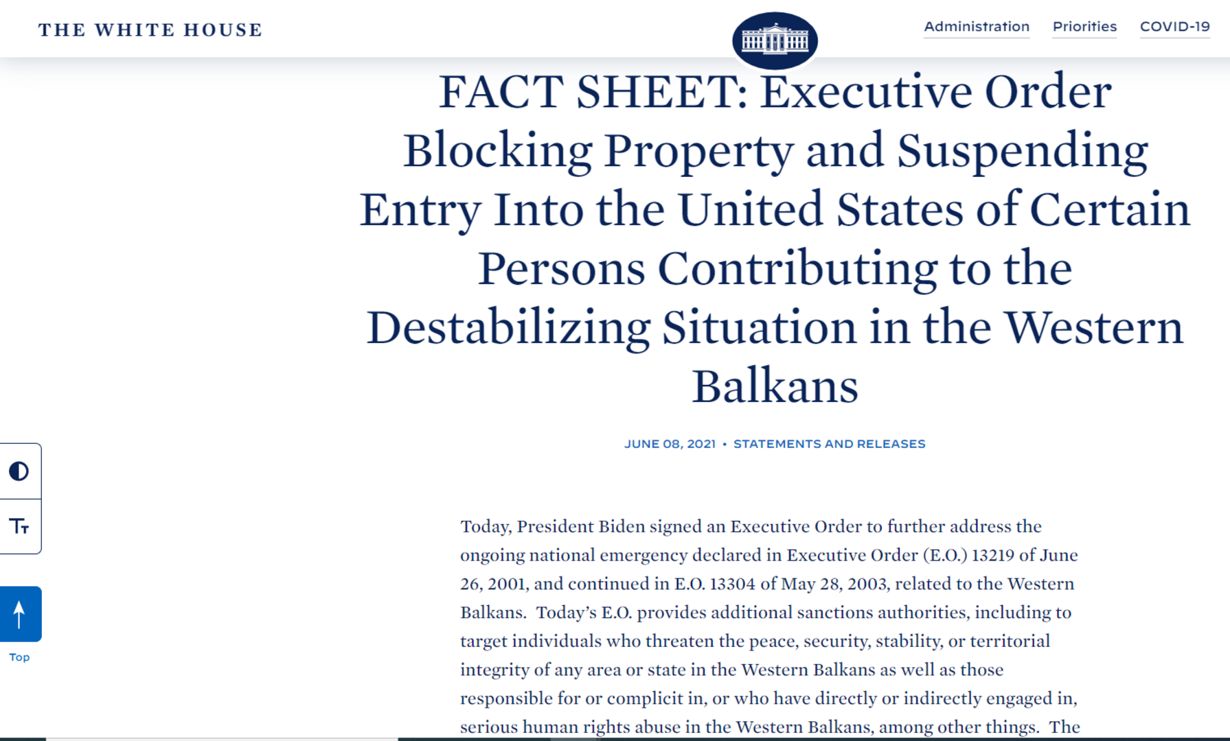 Joe Biden, predsjednik Sjedinjenih Američkih Država, jučer je u Bijeloj kući potpisao Izvršnu naredbu o uvođenju novih sankcija političkim zvaničnicima na zapadnom Balkanu. Uz bivšu Jugoslaviju, na listu je pridodata i Albanija.