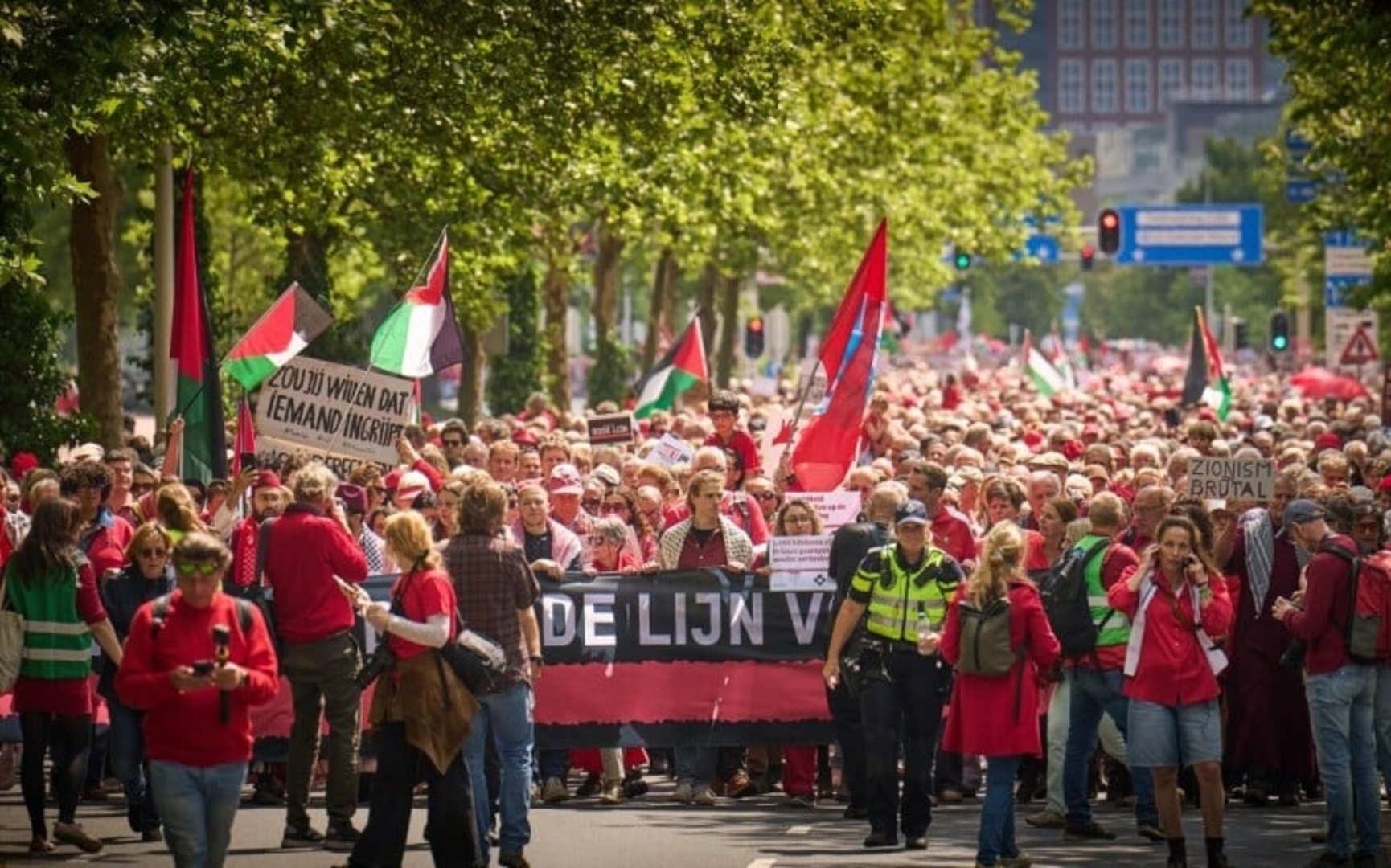 Organizator Oxfam Novib rekao je da se maršu pridružilo oko 100.000 demonstranata, većina odjevena u crveno izražavajući želju za "crvenom linijom" protiv izraelske opsade Gaze, koji je prekinuo opskrbu lijekovima, hranom i gorivom.
