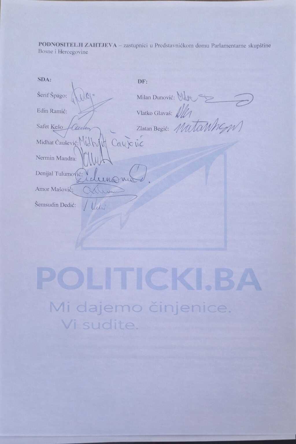 Šerif Špago, Edin Ramić, Midhat Čaušević, Šemsudin Dedić, Safet Kešo, Nermin Mandra, Amor Mašović, Denijal Tulumović iz Stranke demokratske akcije te Milan Dunović, Vlatko Glavaš i Zlatan Begić iz Demokratske fronte potpisali su jutros apelaciju Ustavnom sudu Bosne i Hercegovine.