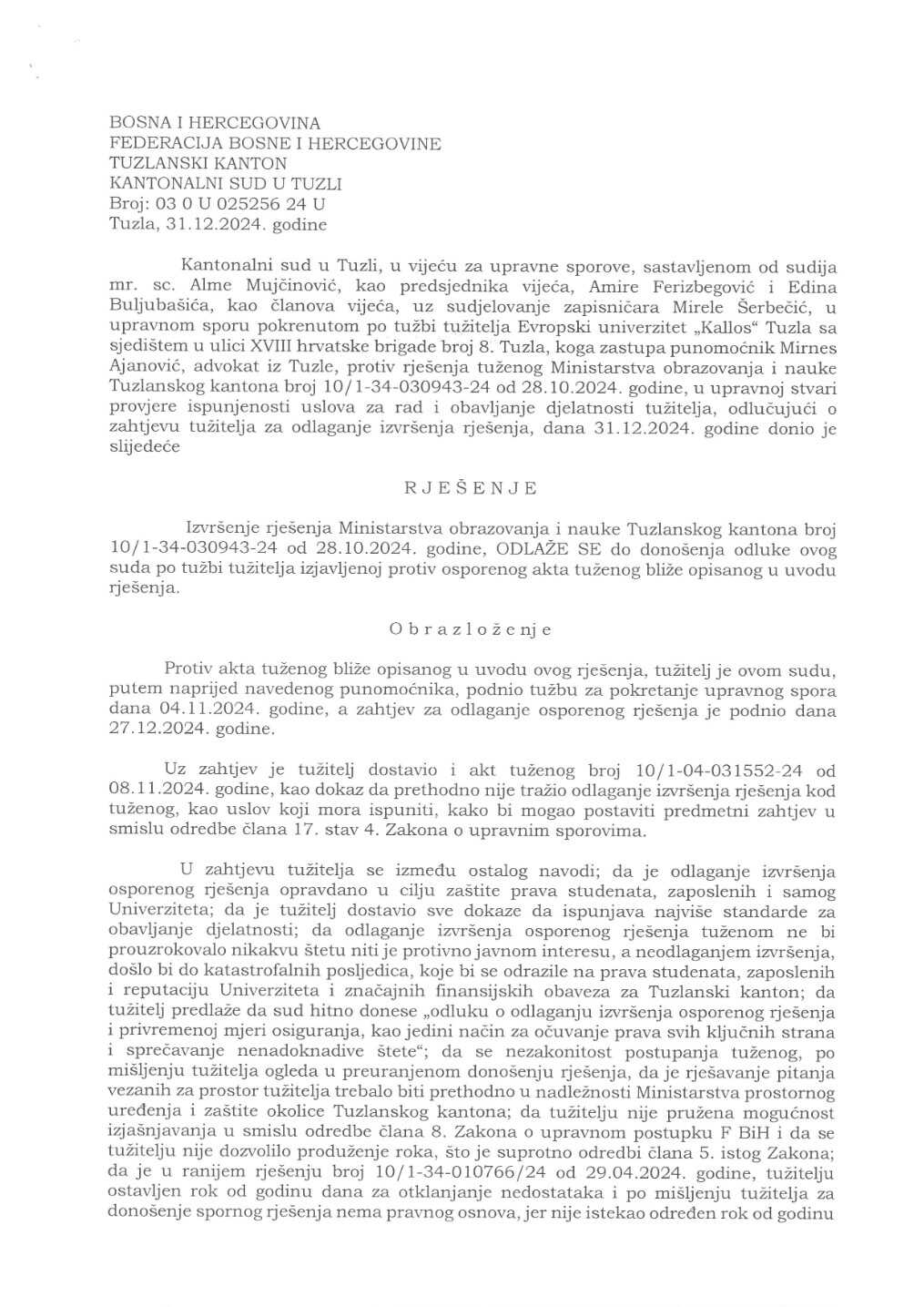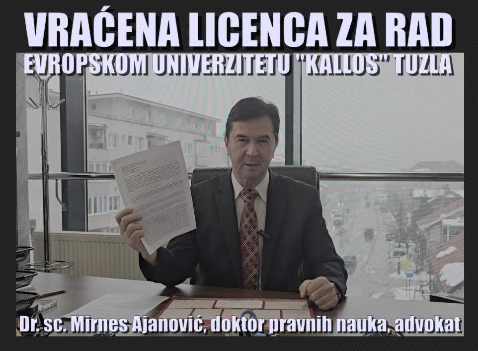 Advokat Evropskog univerziteta "Kallos" Tuzla, dr. sc. Mirnes Ajanović, obavještava javnost da je Kantonalni sud u Tuzli, u sastavu tročlanog vijeća, 31. decembra 2024. godine, koja je danas preuzeta, donio odluku o odlaganju izvršenja rješenja Ministarstva obrazovanja, nauke, kulture i sporta TK kojim je Evropskom univerzitetu "Kallos" Tuzla oduzeta licenca.