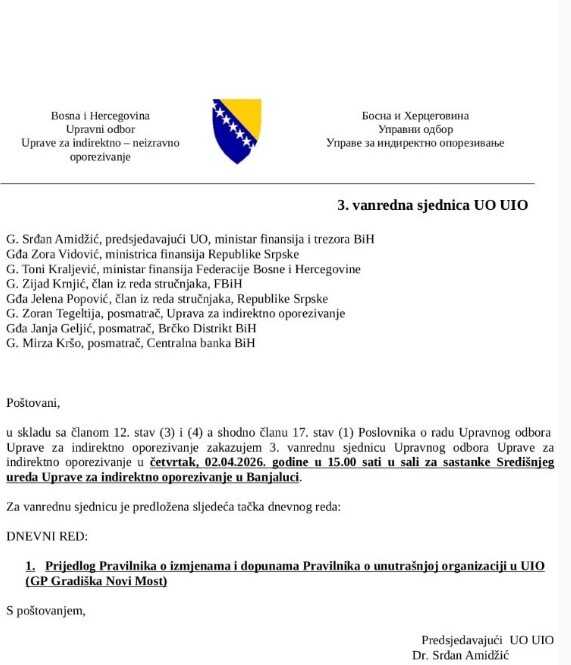 Kako se u dokumentu navodi, 3. redovna sjednica bi se trebala održati u četvrtak, 2. aprila 2026, sa početkom u 15:00, u sali za sastanke Centralnog ureda UIO u Banjoj Luci.