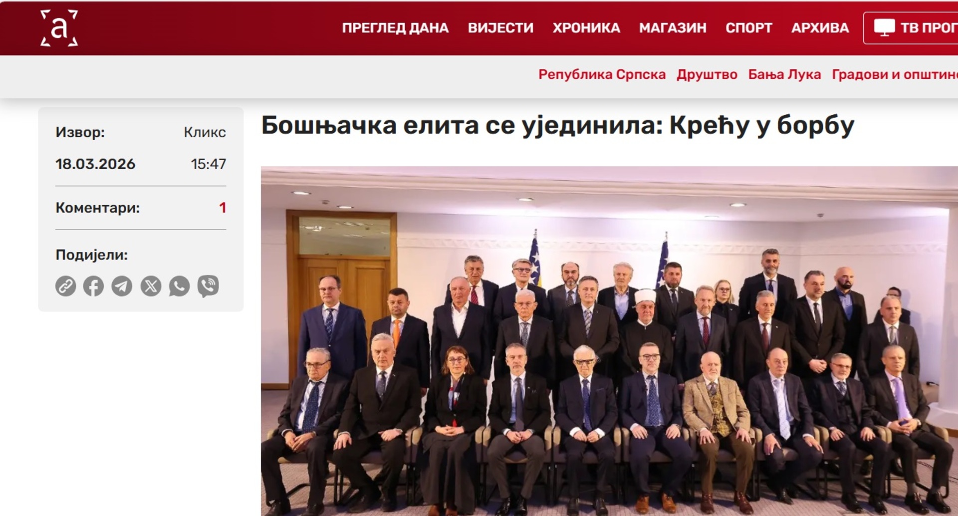 Bošnjačka "elita", koja se kreće od Bakira Izetbegovića, preko Mustafe Cerića, pa do Rame Isaka i Zukana Heleza, ujedinila se i potpisala zajedničku izjavu kojom iznose stav o zlonamjernoj kampanji koja se vodi protiv Bošnjaka i BiH, javlja jedan od 'medija' Milorada Dodika - Alternativna Televizija.