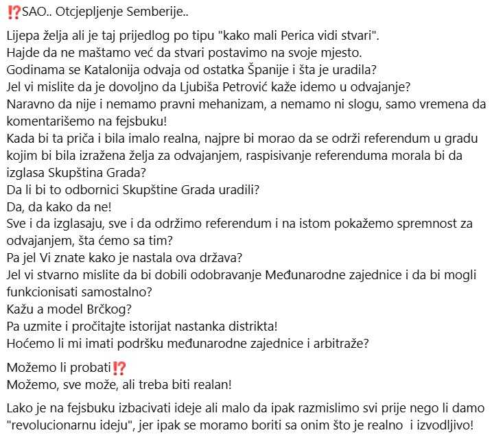 "Ne slažem se sa tim da je odnos republičkog nivoa prema Bijeljini maćehinski, a prema nekim drugim opštinama i gradovima majčinski, jer kada malo bolje pogledamo i kada dobro razmislite shvatićete da ni u jednom gradu u Srpskoj se već godinama ne dešava ništa i ne izgrađuje se bilo kakav kapitalni projekat da bi mi ovdje u Bijeljini bilo kom gradu ili opštini zavidjeli. Navedite mi grad u kojem cvjetaju ruže, u kojem je otvorena fabrika, urađen višemilionski kapitalni projekat, grad kojem se ljudi vraćaju. Odgovor: Ne postoji", napisao je Petrović na svom Facebooku profilu, koji se tako obratio građanima i građankama Bijeljine.