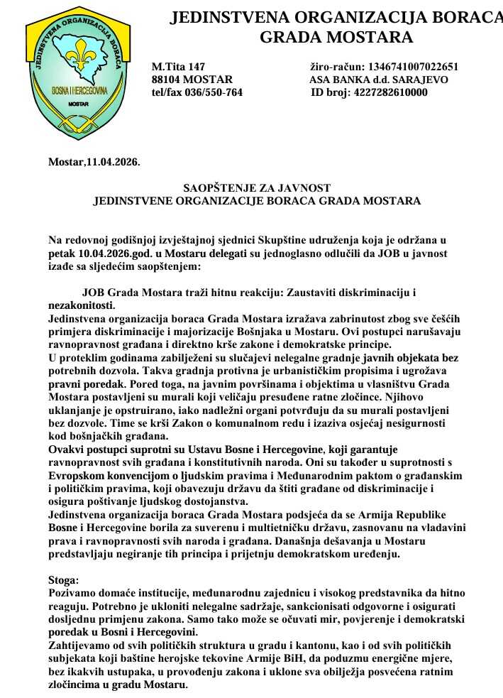 Jedinstvena organizacija boraca Grada Mostara zatražila je hitnu reakciju domaćih i međunarodnih institucija zbog, kako navode, sve izraženijih oblika diskriminacije i kršenja zakona na području ovog grada.