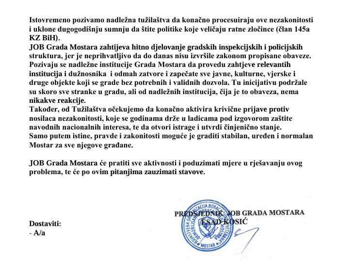 Iz organizacije navode da su u proteklim godinama zabilježeni slučajevi nelegalne gradnje javnih objekata bez potrebnih dozvola, što smatraju direktnim kršenjem urbanističkih propisa. Posebno ističu i postavljanje murala na javnim površinama i objektima u vlasništvu Grada Mostara, koji veličaju presuđene ratne zločince.