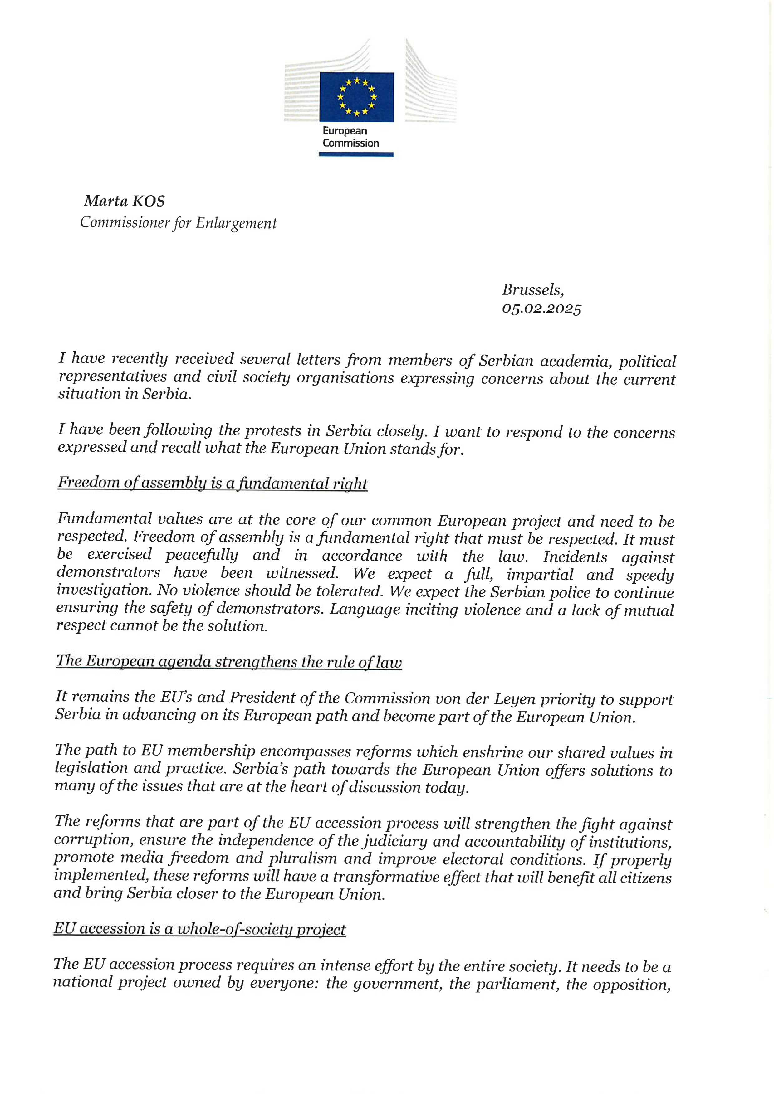 Važno je da se stvore uslovi za inkluzivan dijalog koji uključuje sve zainteresirane strane, političke aktere, institucije i članove civilnog društva koji će se baviti reformama koje su neophodne za evropsku budućnost Srbije. To će ojačati srbijansko društvo i konsolidirati put Srbije ka članstvu u EU - završila je Kos svoje pismo.