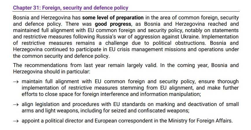 Jedno od iznimno rijetkih mjesta u Izvještaju o napretku Bosne i Hercegovine prema Evropskoj uniji nalazi se u Poglavlju 31 ovog dokumenta.