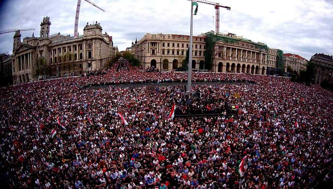 Demonstranti su došli do parlamenta po neuobičajeno toplom proljetnom vremenu, a neki od njih su uzvikivali "Mi se ne bojimo" i "Orbane daj ostavku!".