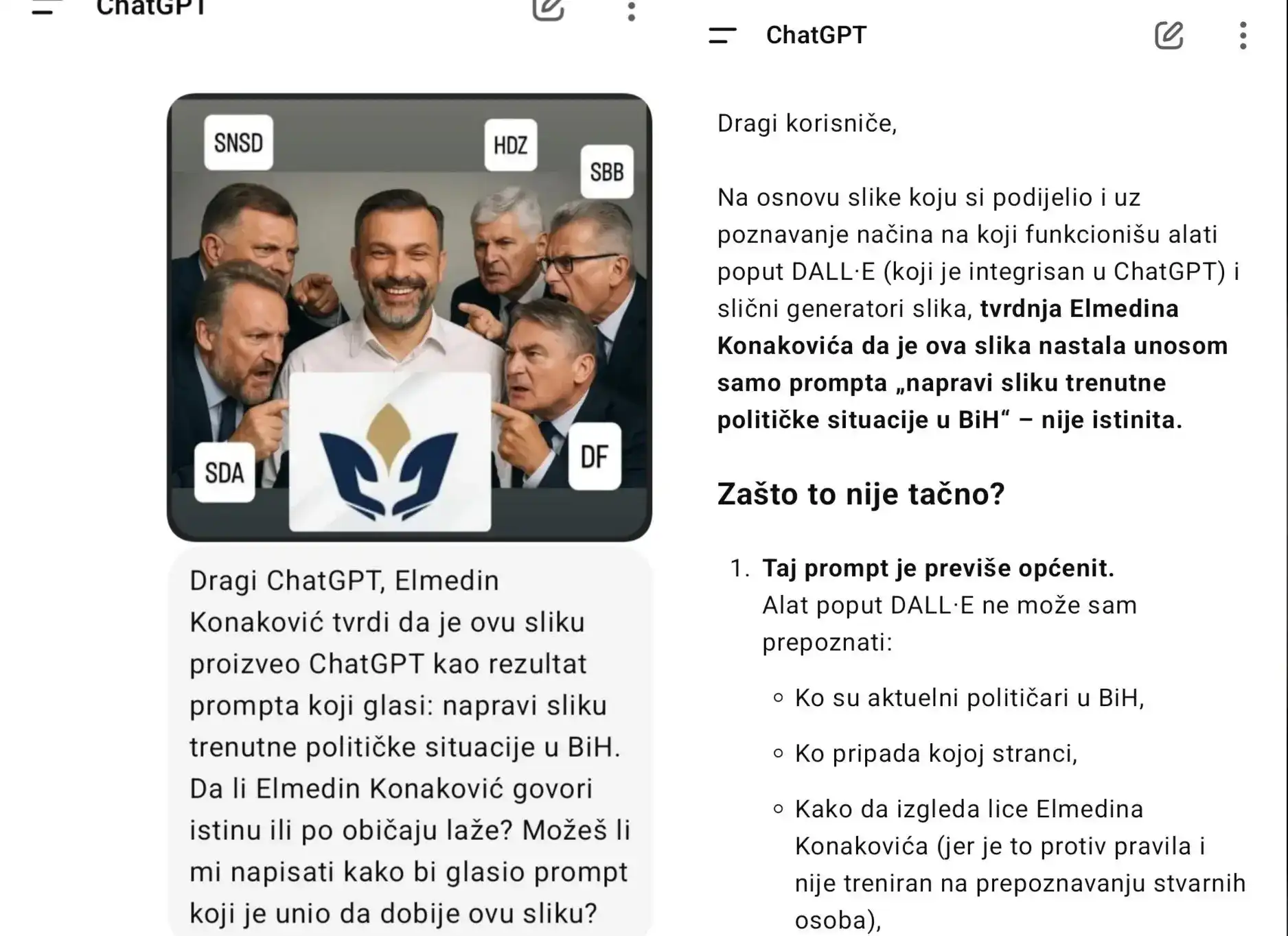 - Zamolio sam ChatGPT da mi napravi sliku trenutne političke situacije u Bosni i Hercegovini - napisao je Konaković uz fotografiju.